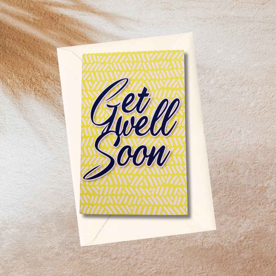 Gele beterschapskaart met de tekst Get well soon