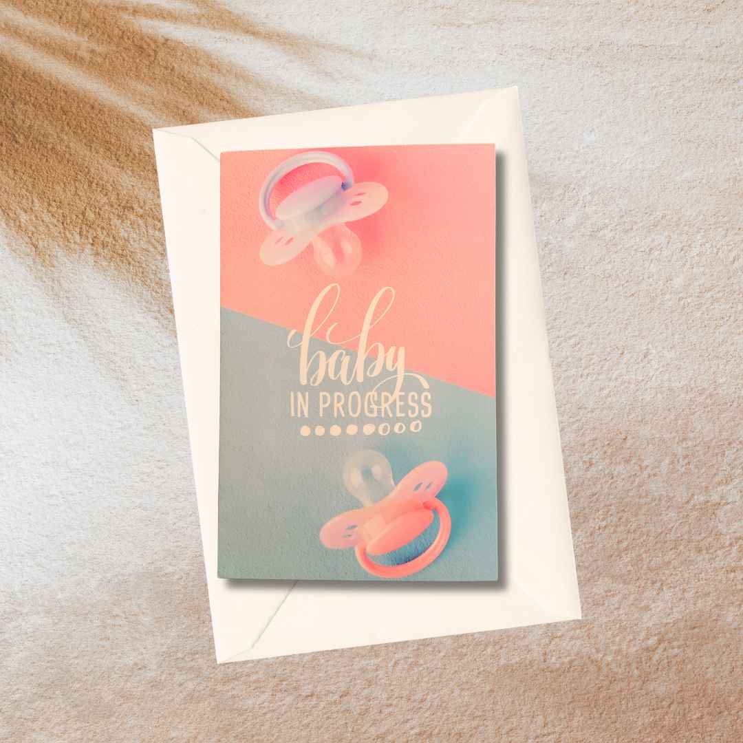 Roze/blauwe kaart met de tekst Baby in progress