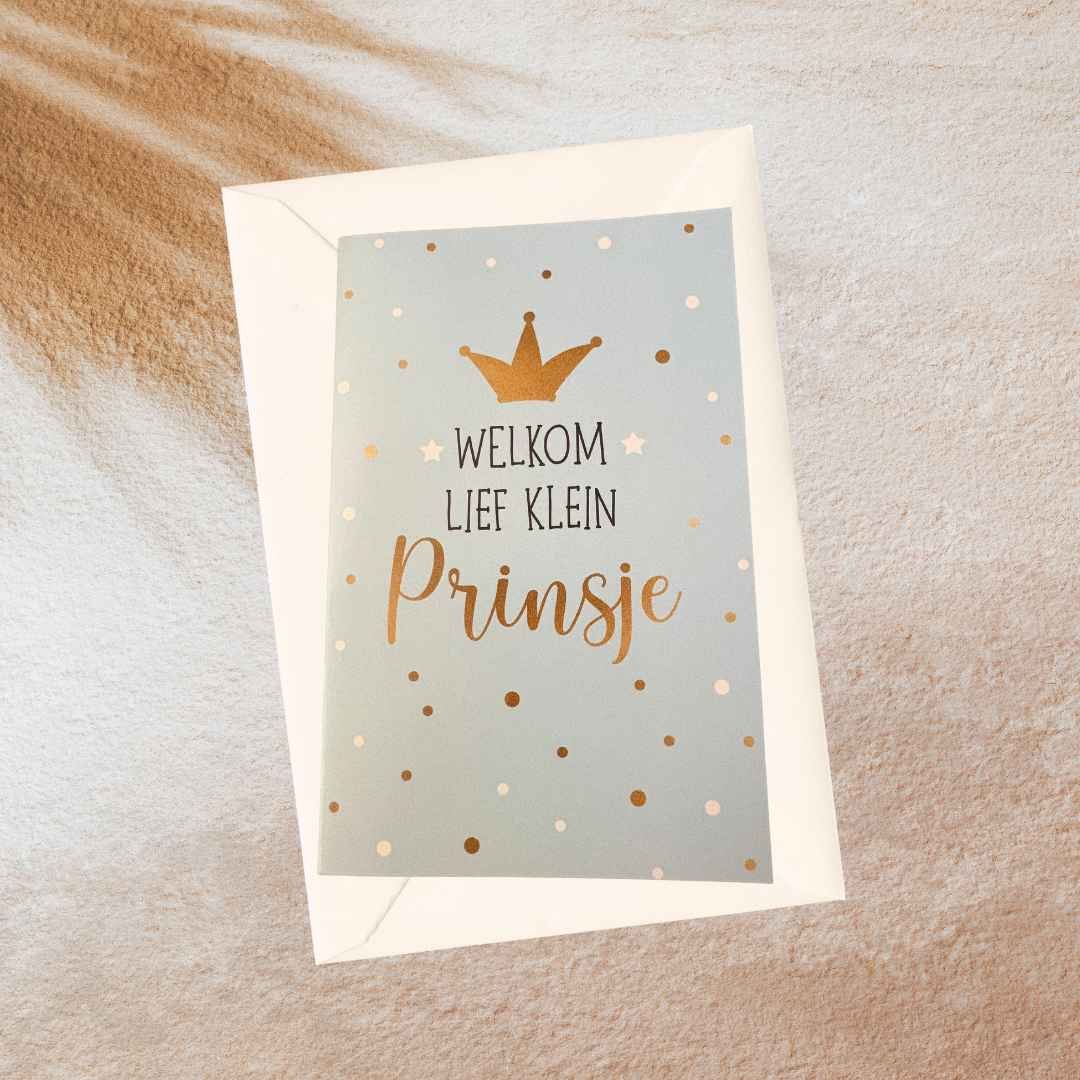 Een blauwe kaart met de tekst: Welkom lief klein prinsje